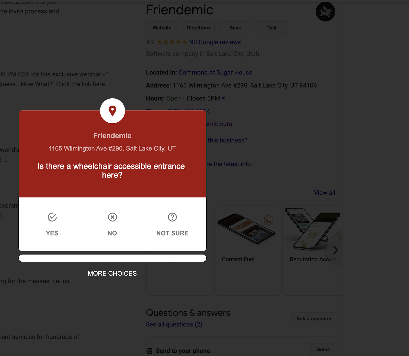 For Friendemic’s GMB, Google is crowdsourcing information regarding accessibility to our building: